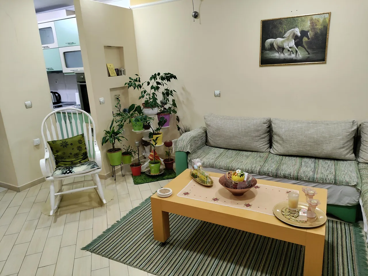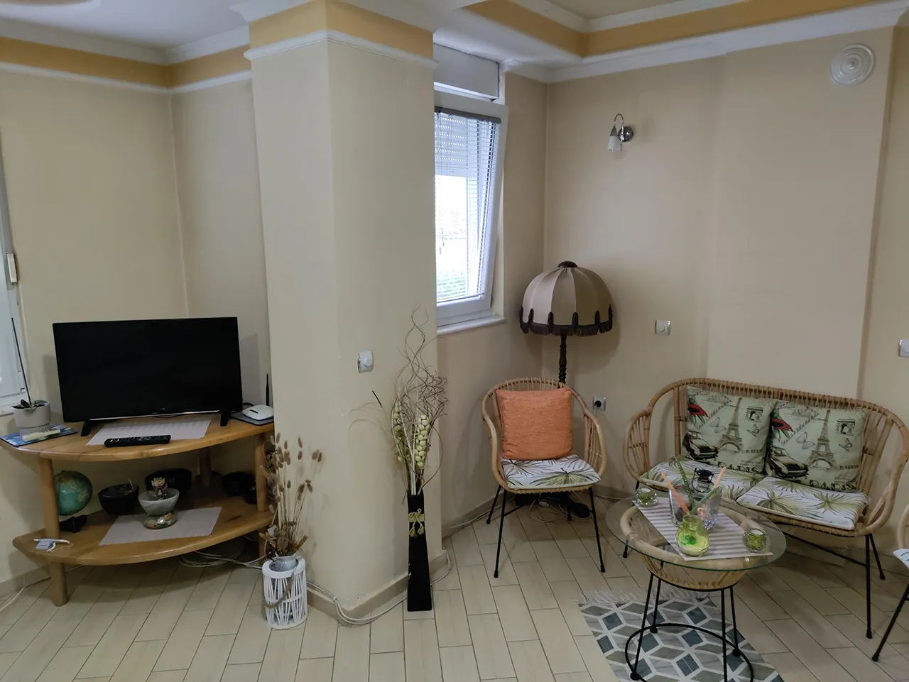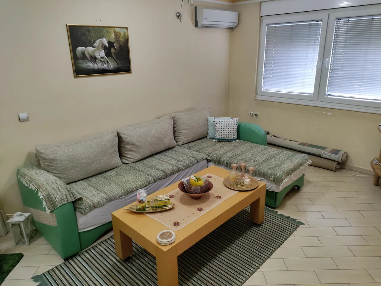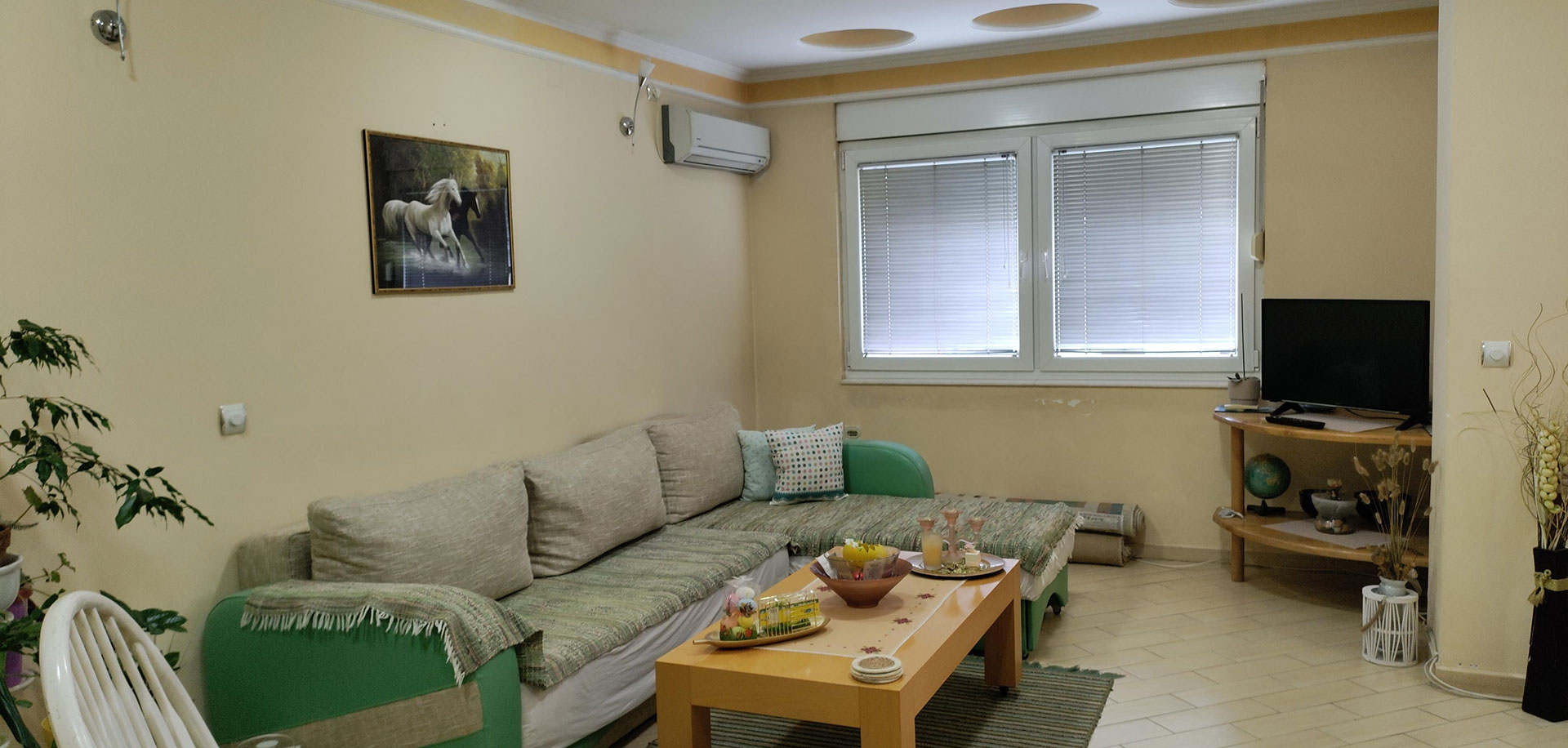 Кога ќе се сместите во природно осветлената дневна соба со голем плазма телевизор (со кабелски канали) и брза интернет мрежа, за да се разладите од високите температури може да го користите клима уредот.