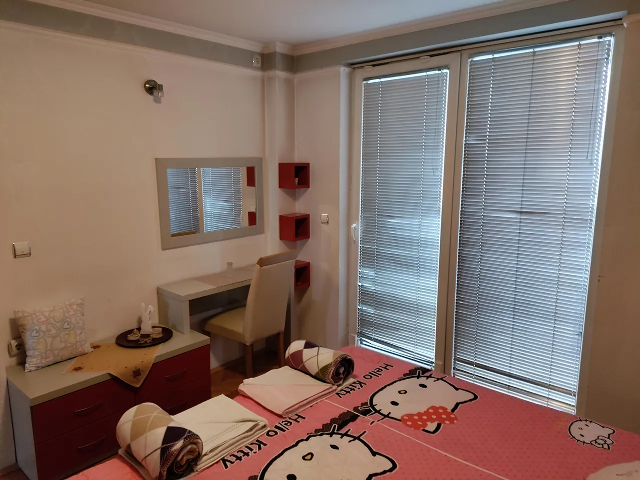Откако ќе се одморите во пространата спална соба (со голем брачен кревет), можете да прошетате низ центарот на градот каде лесно Ви се достапни сите потребни објекти (супермаркет, кафе-бар, продавница за домаќинство, бутици, пекарница, бурекџилница, слаткарница, ресторани специјализирани за скара, пица и риба) на растојание од 300 метри од апартманот.
